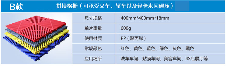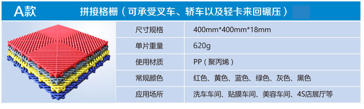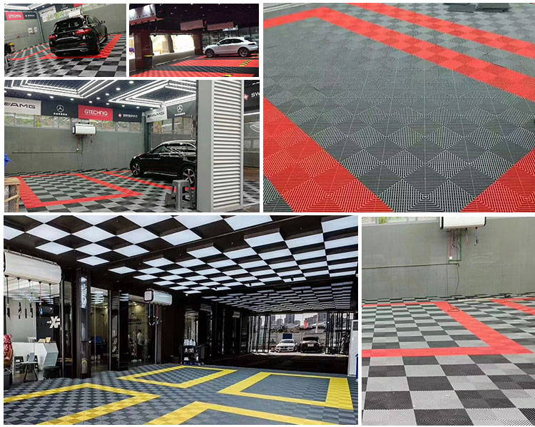 Multifunctional modular floor mat with high strength, waterproof and oil bearing, brilliant color, simple construction, waterproof and antifouling, odorless and non-toxic and many other advantages, is widely used in the family balcony, car repair shops, car 4S stores, bath center, exhibition hall, public toilet, hotel corridor and other places.